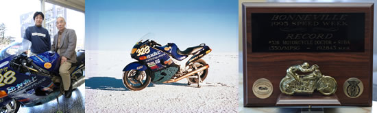 助走1マイル測定区間1マイル、その往復の記録の平均値だから、特に助走の路面状態の悪い復路の走行は大変。ライダーの宮崎敬一郎君がよくぞがんばってくれた。もちろん、このボンネビルの2輪車の最高速を記録した車にも、マイクロロンの処理からスタートしています